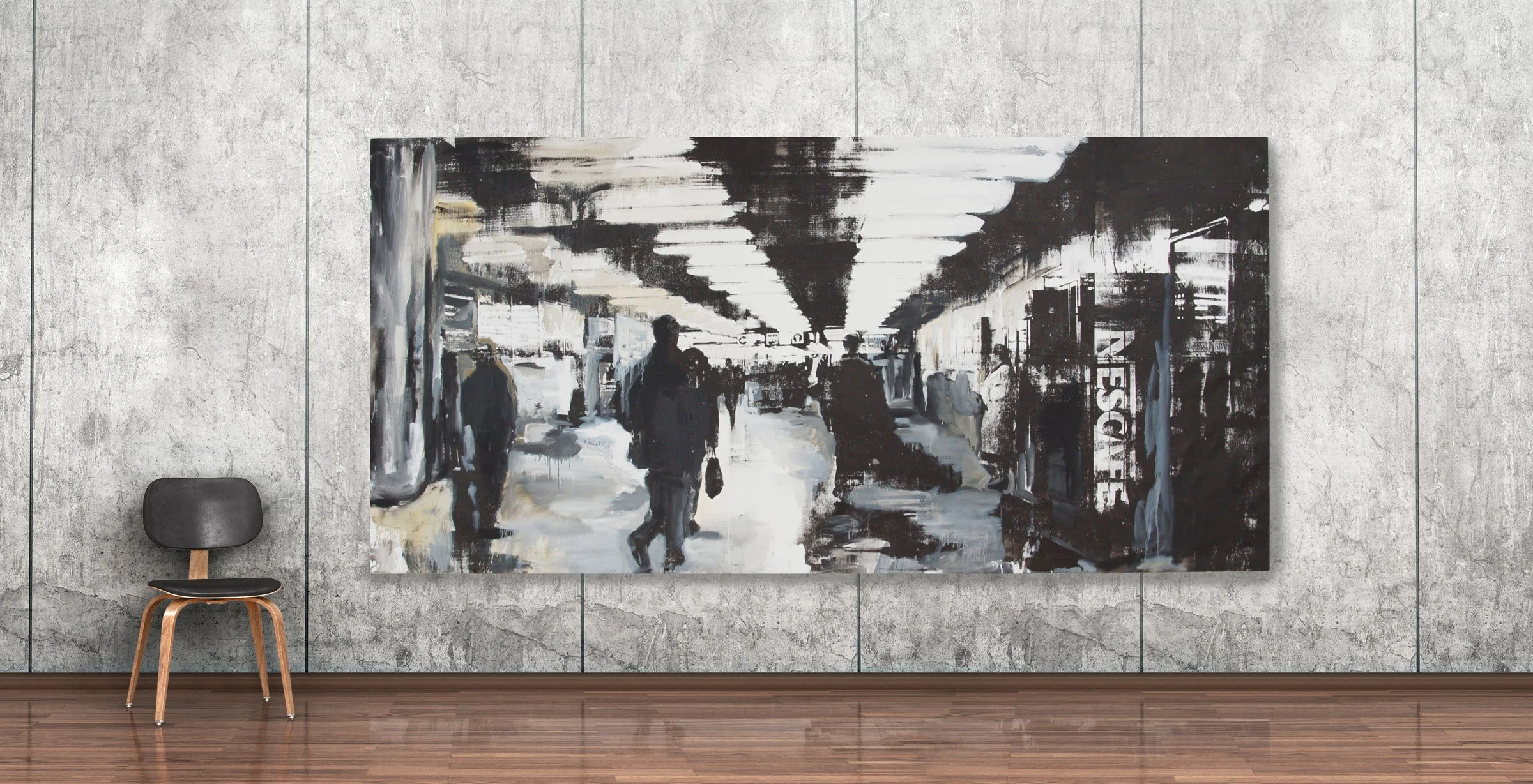 Jehovistka, ruční tisk a olej na plátně, 290 × 150 cmPohyb lidí v podchodu se skládá do proměnlivého rytmu, který je zároveň rozptýlený a neuspořádaný. Jednotlivé světy se míjejí, překrývají a na okamžik vytvářejí společný celek.1 10 000 Kč