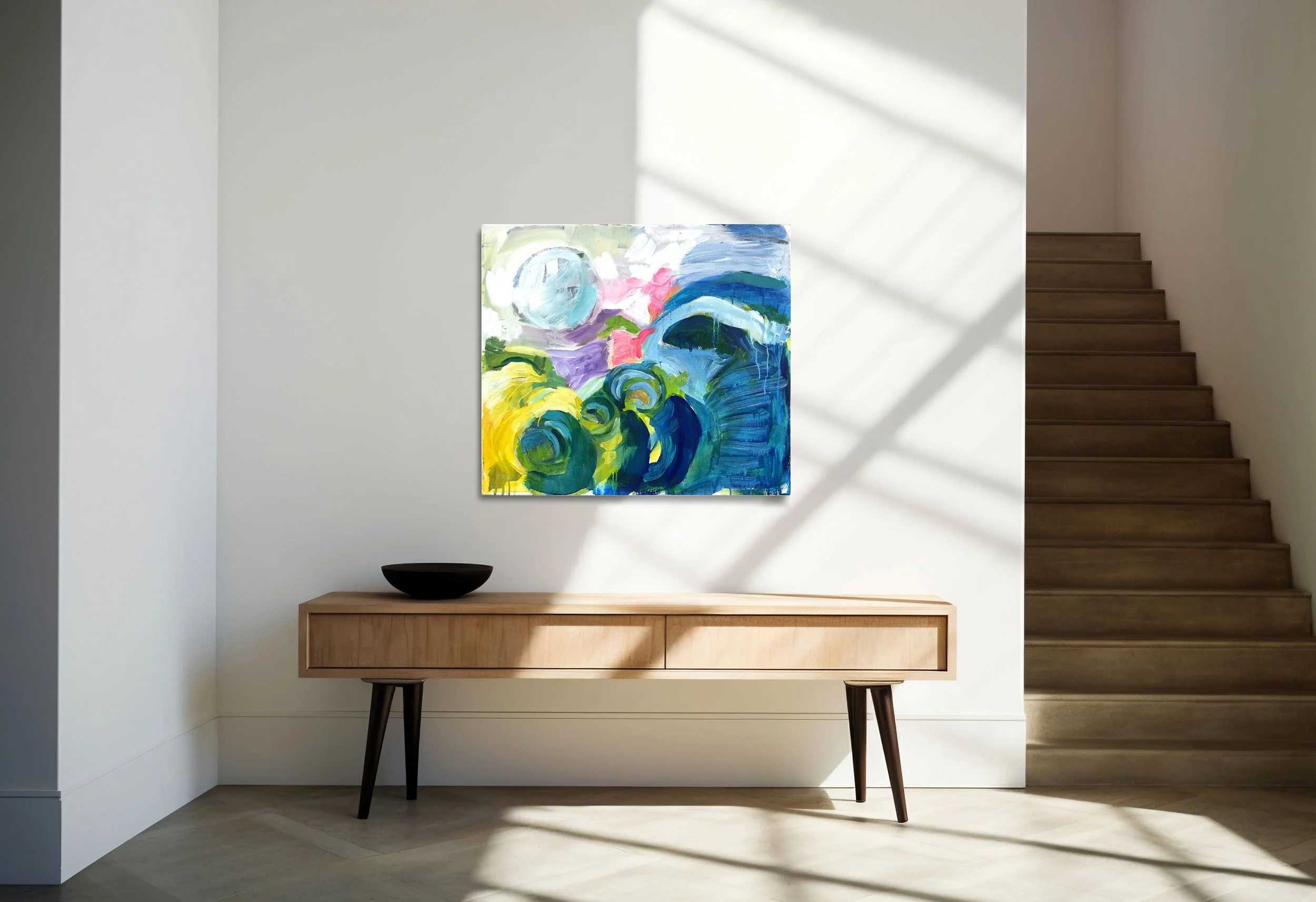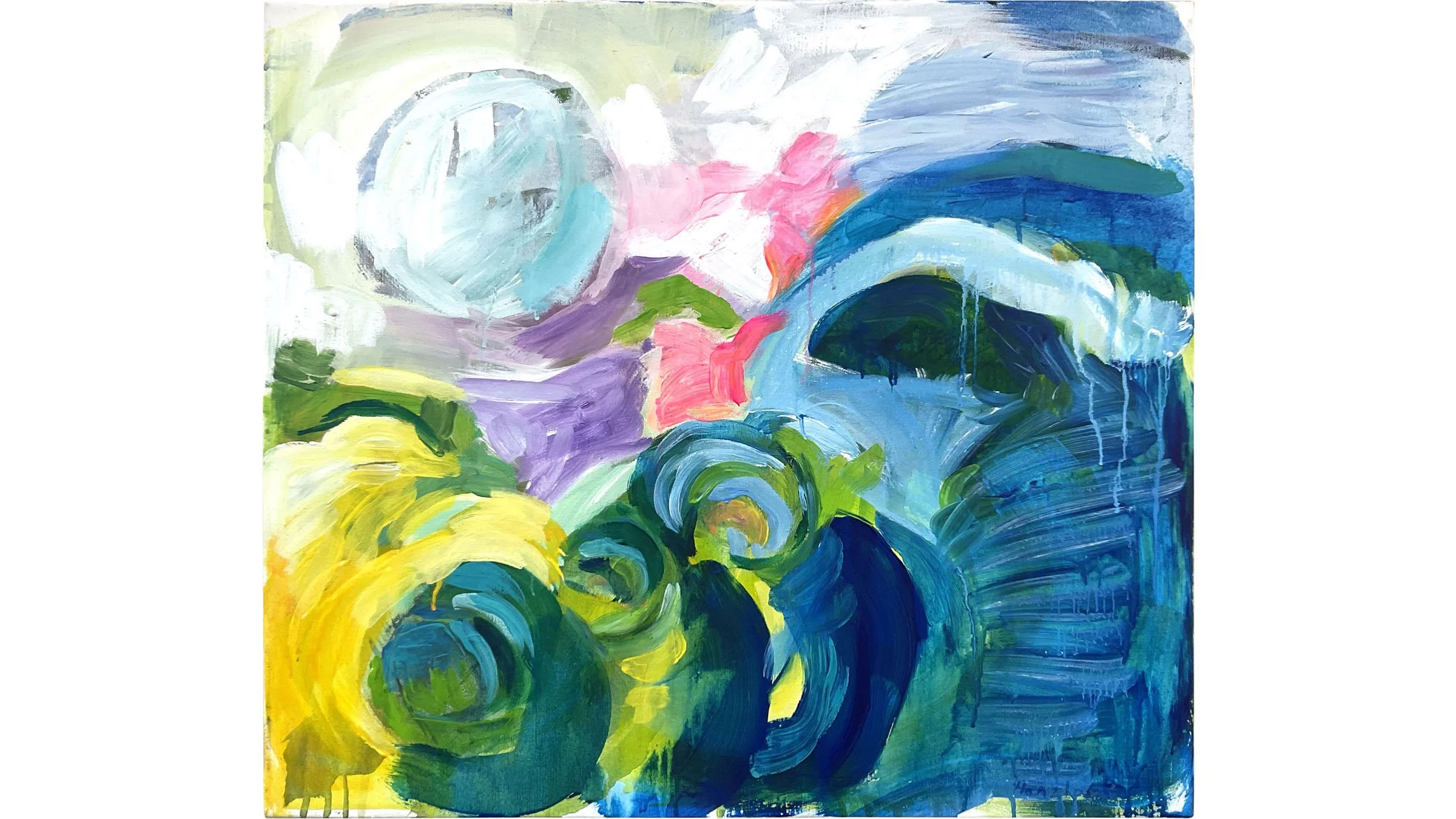 Zdá se, že stačí “jen malovat” není třeba příliš zapojovat mozek. A to je dost osvobozující. Organické, vířivé tvary se setkávají s klidnější, horizontálně vedenou plochou, která jejich pohyb zpomaluje a zadržuje.